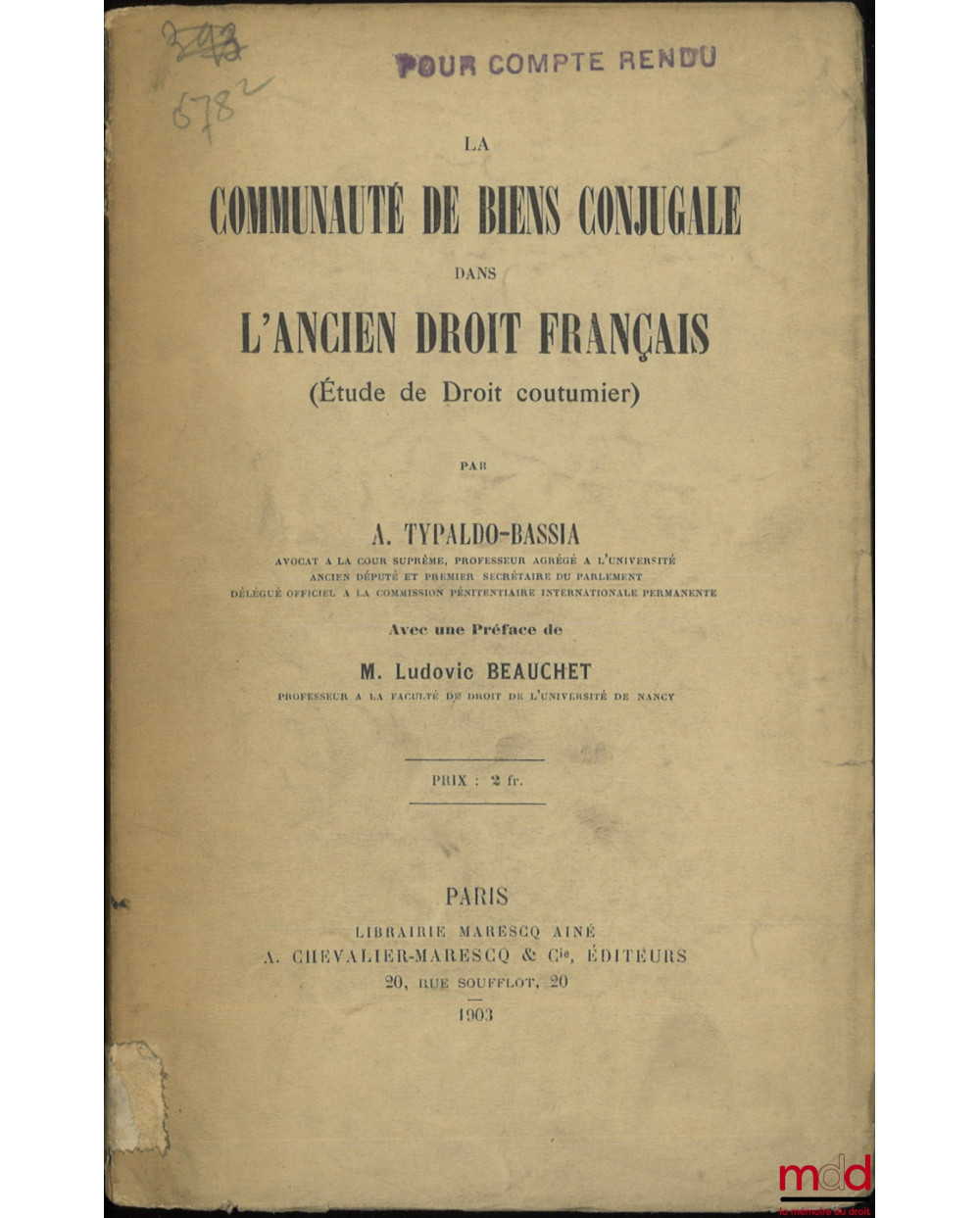 LA COMMUNAUTÉ DE BIENS CONJUGALE DANS L’ANCIEN DROIT FRANÇAIS (Étude de Droit coutumier), Avec une préface de M. Ludovic Beauchet