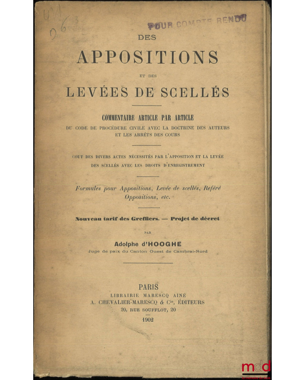 DES APPOSITIONS ET DES LEVÉES DE SCELLÉS, Commentaire article par article du code de procédure civile avec la doctrine des auteurs et les arrêts des cours, Coût des divers actes nécessités par l’apposition et la levée des scellés avec les droits d’enregistrement, Formules pour Appositions, Levée de scellés, Référé, Opposition, etc., Nouveau tarif des Greffiers. - Projet de décret