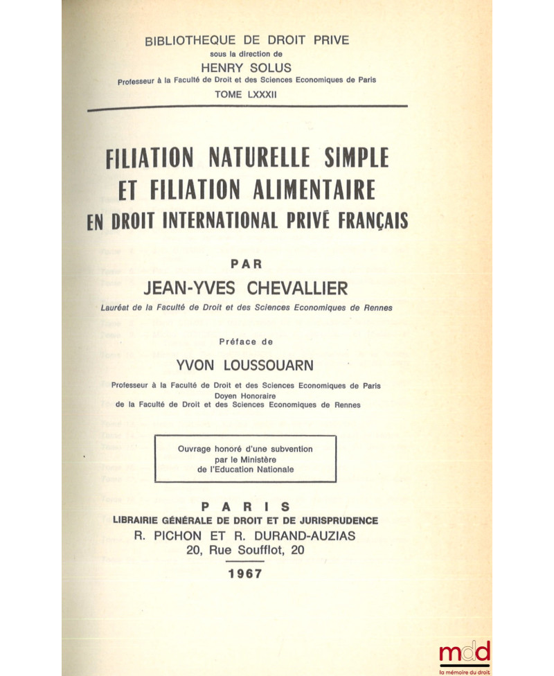 FILIATION NATURELLE SIMPLE ET FILIATION ALIMENTAIRE EN DROIT INTERNATIONAL PRIVÉ FRANÇAIS, Préface de Yvon Loussouarn, Bibl. de droit privé, t. LXXXII