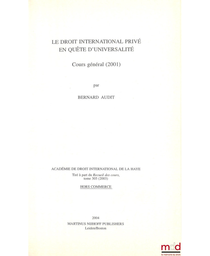 « [l’auteur] rappelle que bien que l’universalisme classique se heurte à la diversité du droit et de ses solutions et qu’un droit international privé uniforme soit sans doute une chimère, il existe un modèle commun de droit international privé qui, s’il est d’origine occidental, s’est imposé à peu près partout. Ce modèle repose sur plusieurs postulats : l’existence des relations internationales, la reconnaissance aux institutions et mécanismes sociaux étrangers du caractère de droit, l’admission des étrangers à la jouissance des droits, le caractère interétatique du droit international privé, et la distinction du conflit de lois et du conflit de juridictions. Le professeur Audit s’attache, dans une première partie, à vérifier la diffusion de ce modèle commun à travers le monde, en procédant à un examen des sources du droit international privé, à propos desquelles l’auteur constate qu’elles présentent une large unité formelle. Le professeur Audit entreprend dans les développements suivants de prendre la mesure exacte de l’uniformité des solutions derrière cette convergence formelle, et ainsi des limites de l’universalité ou de la tâche qui reste à accomplir, qu ce soit en matière de conflits de lois ou de conflits de juridictions. »