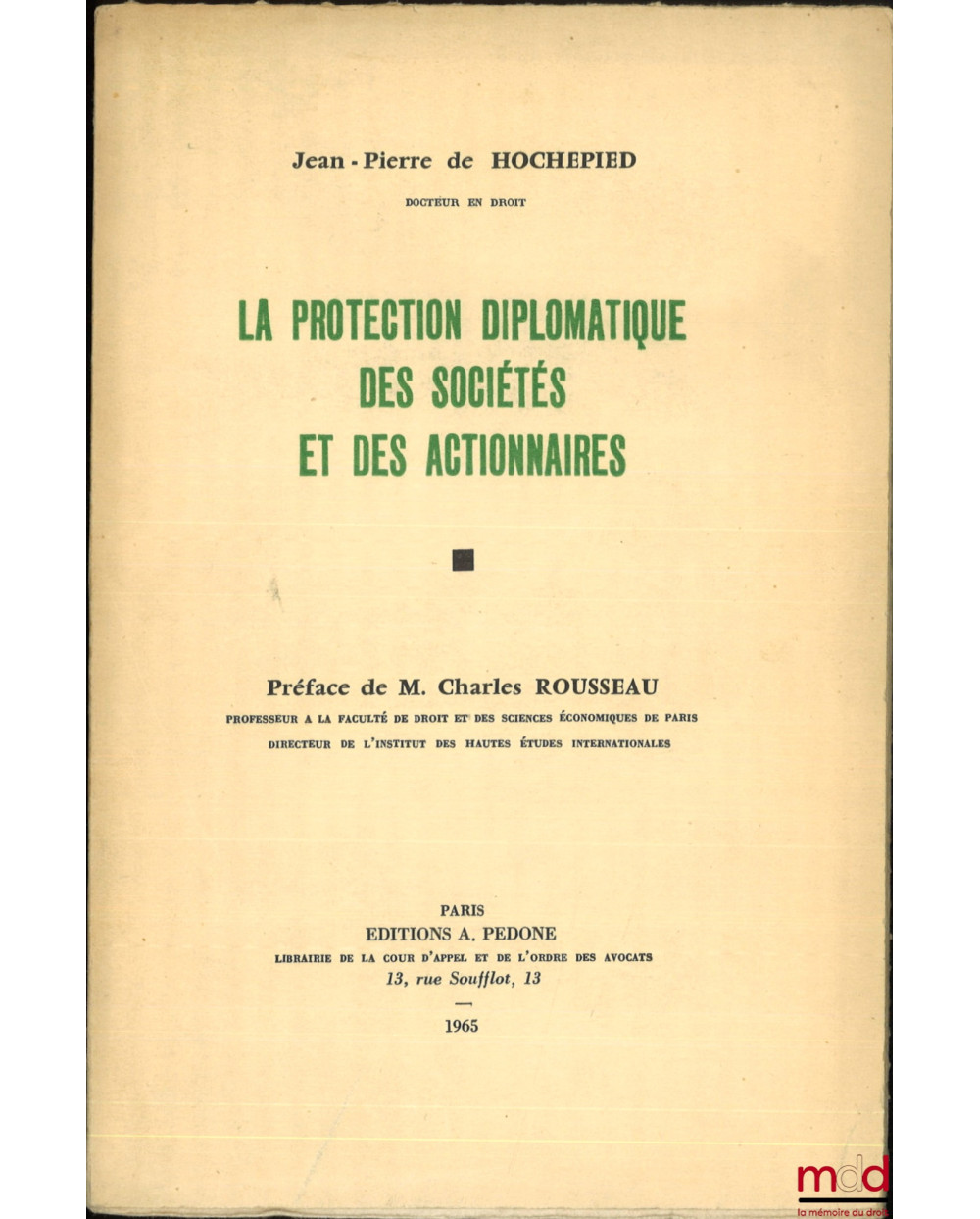 LA PROTECTION DIPLOMATIQUE DES SOCIÉTÉS ET DES ACTIONNAIRES, Préface de Charles Rousseau, Université de Paris, Faculté de droit et des sciences économiques