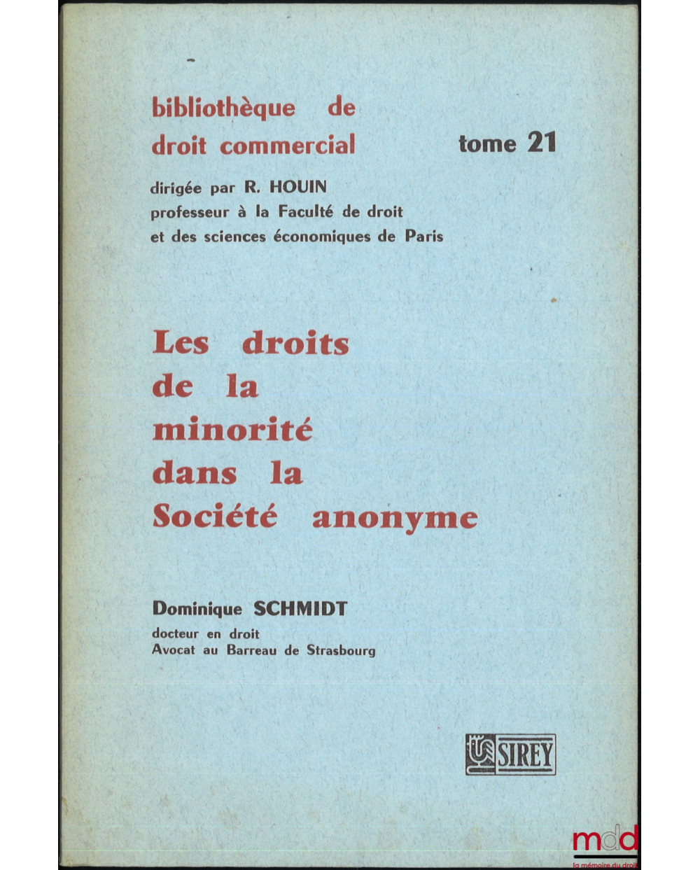 LES DROITS DE LA MINORITÉ DANS LA SOCIÉTÉ ANONYME, Préface de Jean-Marc Bischoff, Bibl. de droit commercial, t. 21