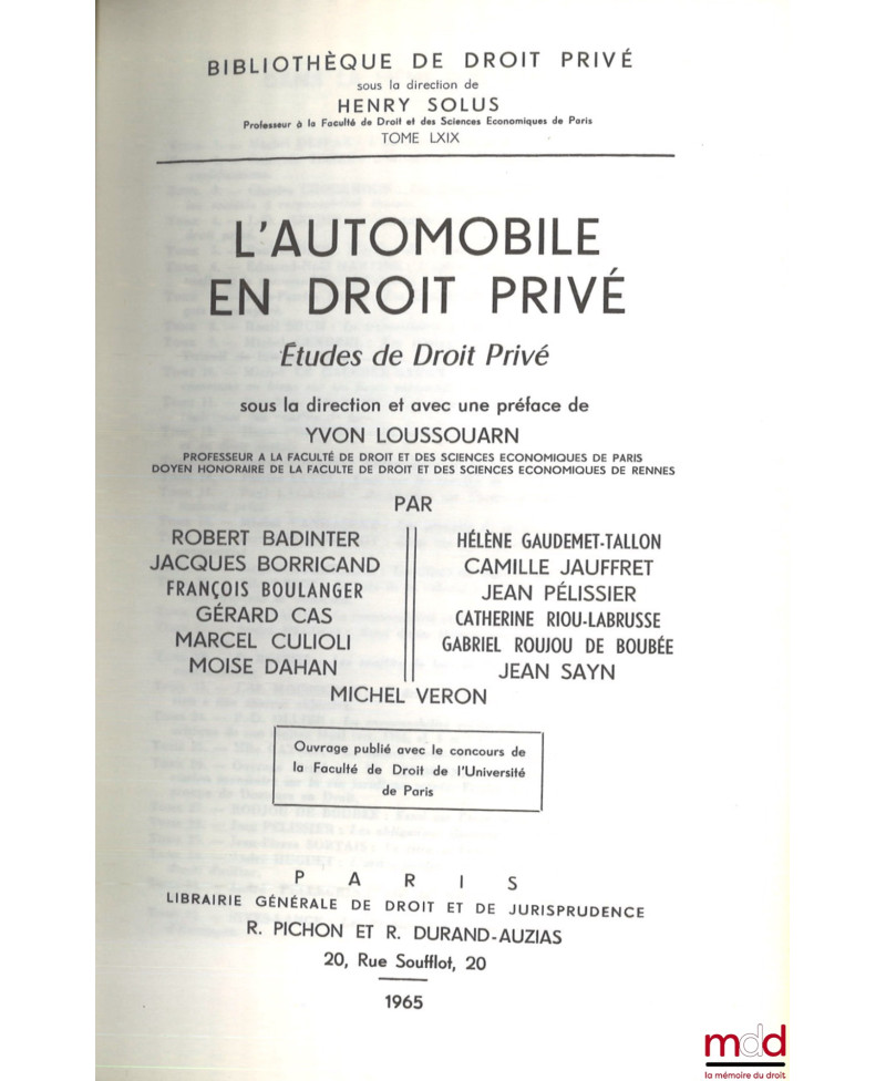 L’AUTOMOBILE EN DROIT PRIVÉ, Études de droit privé sous la direction et avec une Préface de Yvon Loussouarn, Bibl. de droit privé, t. LXIX