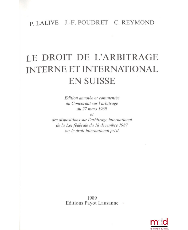 LE DROIT DE L’ARBITRAGE INTERNE ET INTERNATIONAL EN SUISSE, Éd. annotée et commentée du Concordat sur l’arbitrage du 27 mars 1969 et des dispositions sur l’arbitrage international de la Loi fédérale du 18 décembre 1987 sur le droit international privé