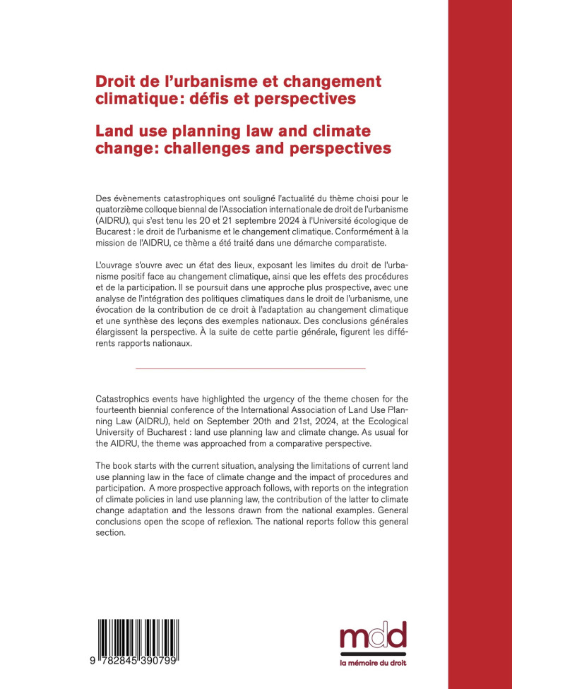 Des événements catastrophiques ont souligné l’actualité du thème choisi pour le quatorzième colloque biennal de l’Association internationale de droit de l’urbanisme (AIDRU), qui s’est tenu les 20 et 21 septembre 2024 à l’Université écologique de Bucarest: le droit de l’urbanisme et le changement climatique. Conformément à la mission de l’AIDRU, ce thème a été traité dans une démarche comparatiste.L’ouvrage s’ouvre avec un état des lieux, exposant les limites du droit de l’urbanisme positif face au changement climatique, ainsi que les effets des procédures et de la participation. Il se poursuit dans une approche plus prospective, avec une analyse de l’intégration des politiques climatiques dans le droit de l’urbanisme, une évocation de la contribution de ce droit à l’adaptation au changement climatique et une synthèse des leçons des exemples nationaux. Des conclusions générales élargissent la perspective. À la suite de cette partie générale, figurent les différents rapports nationaux.Catastrophics events have highlighted the urgency of the theme chosen for the fourteenth biennial conference of the International Association of Land Use Planning Law (AIDRU), held on September 20th and 21st, 2024, at the Ecological University of Bucharest: land use planning law and climate change. As usual for the AIDRU, the theme was approached from a comparative perspective.The book starts with the current situation, analysing the limitations of current land use planning law in the face of climate change and the impact of procedures and participation. A more prospective approach follows, with reports on the integration of climate policies in land use planning law, the contribution of the latter to climate change adaptation and the lessons drawn from the national examples. General conclusions open the scope of reflexion. The national reports follow this general section.Intervenant(e)s : Bige AÇIMUZ, Özge AKSOYLU, Sandro AMOROSINO, Fernando ALVES CORREIA, Frédéric BERNARD, Elena BUOSO, Lydia BURGSTALLER, Marion CHAPOUTON, Sigrid DE BOIS, Valérie DÉFAGO, Mircea DUțU, Andrei DUțU­BUZURA, Mircea M. DUțU­BUZURA, Judith GIFREU FONT, Emmanuelle GONTHIER, Francis HAUMONT, Evangelia KOUTOUPA­RENGAKOU, Julien LEJEUNE, Edward MITCHELL, Jacqueline MORAND­DEVILLER, Fernanda Paula OLIVEIRA, Vera PARISIO, Alexandre PIRSON, François PRIET, Frédéric ROLIN, Matthias ROSSI, Anna SIMONATI, Thierry TANQUEREL, Davide TUMMINELLI.