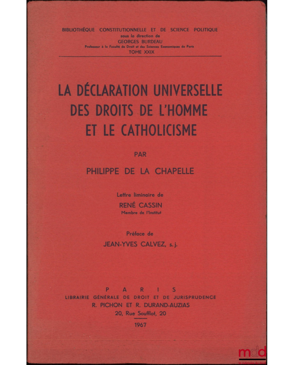 LA DÉCLARATION UNIVERSELLE DES DROITS DE L’HOMME ET LE CATHOLICISME, Lettre liminaire de René Cassin, Préface de Jean-Yves Calvez s.j., Bibl. Constitutionnelle et de Science Po., t. XXIX