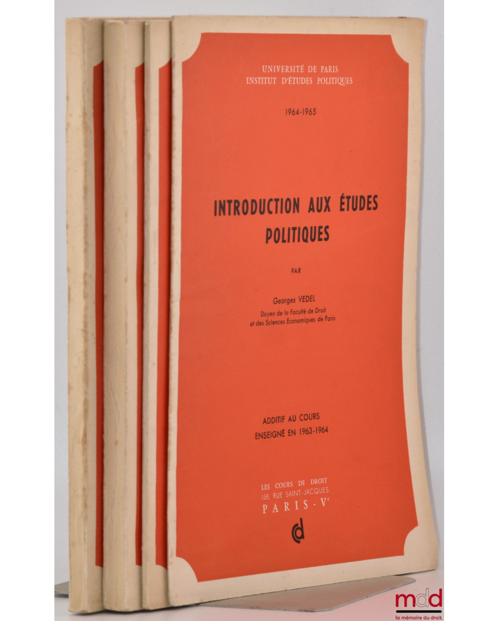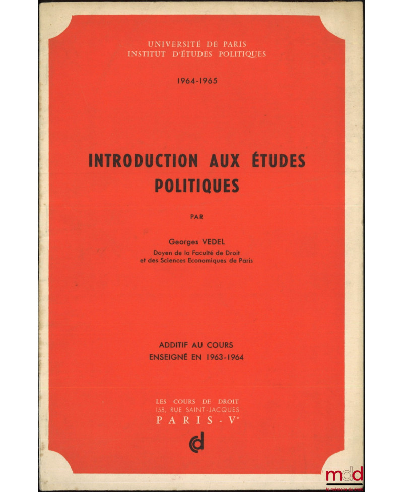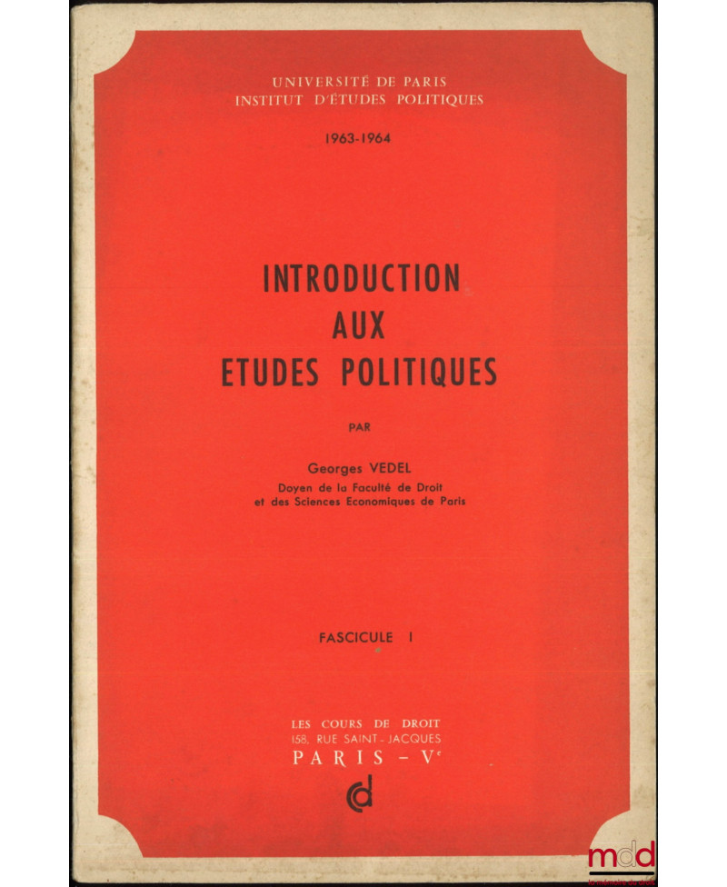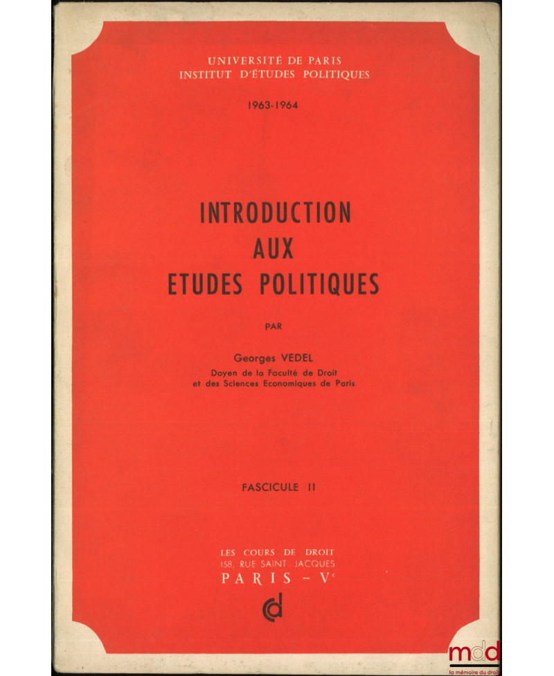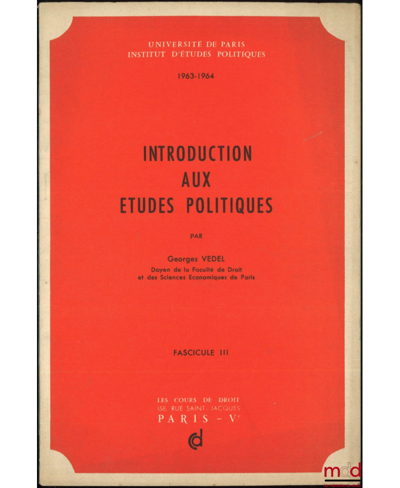 Passionnant cours de Vedel divisé en 3 parties : I. : La formation des grands systèmes politiques ; II. Les institutions et la vie politique française contemporaine ; III. Les systématisations politico-juridiques.