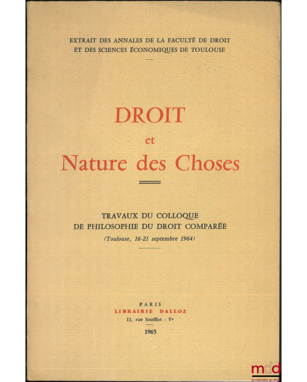 DROIT ET NATURE DES CHOSES, Travaux du colloque de philosophie du droit comparée, Toulouse, 16-21 septembre 1964, extrait des Annales de la Faculté de droit et des sc. éco. de Toulouse