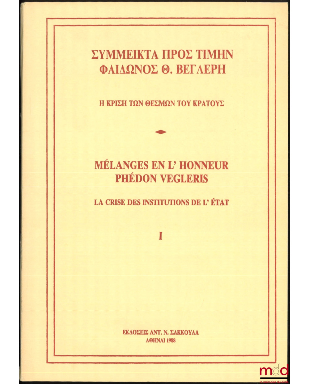 PLATON OU LE SOUCI DE JUSTICE, [Extrait des] Mélanges en l’honneur de Phédon Vegleris, La crise des institutions, I