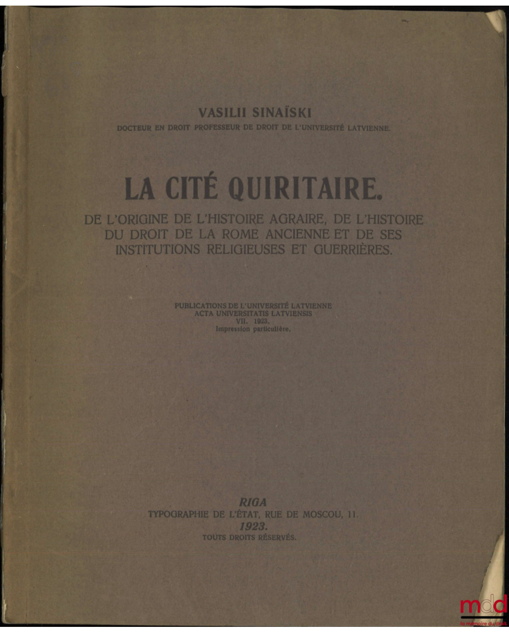 LA CITÉ QUIRITAIRE. De l’origine de l’histoire agraire, de l’histoire du droit de la Rome ancienne et de ses institutions religieuses et guerrières