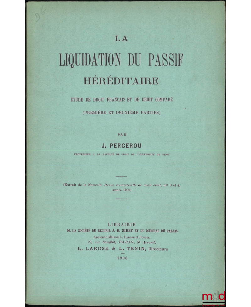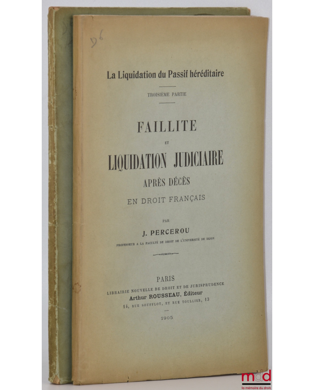 LA LIQUIDATION DU PASSIF HÉRÉDITAIRE, t. I : Étude de droit français et de droit comparé (Première et deuxième parties), (Extrait de la Nouvelle Revue trimestrielle de droit civil, n° 3 et 4 , année 1905), t. II : Faillite et liquidation judiciaire après décès en droit français (Troisième partie)