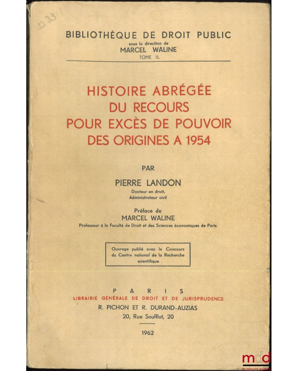 HISTOIRE ABRÉGÉE DU RECOURS POUR EXCÈS DE POUVOIR DES ORIGINES À 1954, Préface de Marcel Waline, Bibl. de droit public, t. IL