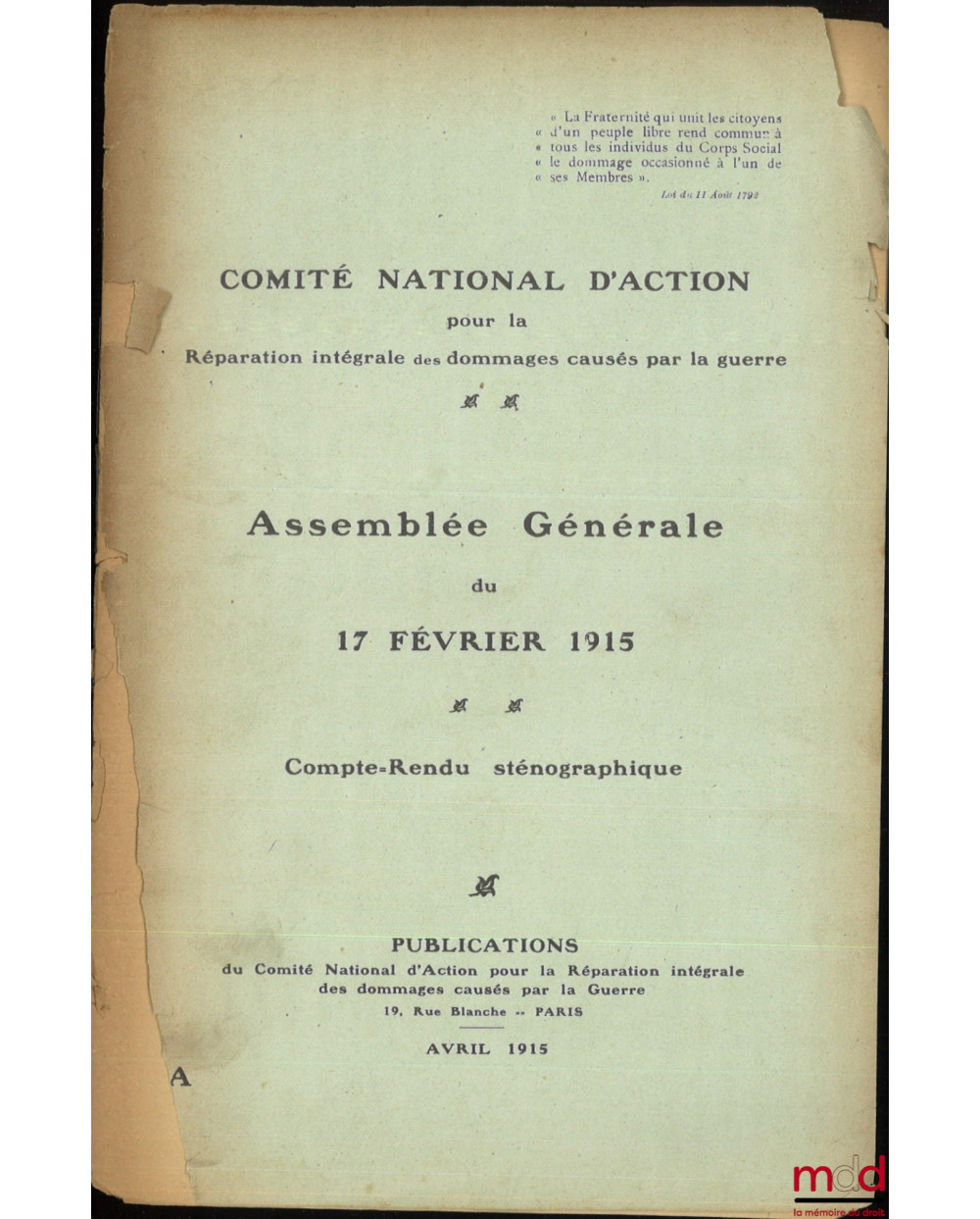 ASSEMBLÉE GÉNÉRALE DU 17 FÉVRIER 1915, Comité national d’action pour la réparation intégrale des dommages causés par la guerre [t.-à-p.]