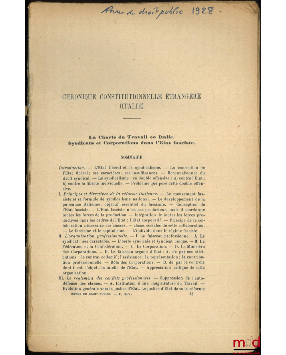 LA CHARTE DU TRAVAIL EN ITALIE. Syndicats et corporations dans l’État fasciste., Chronique constitutionnelle étrangère (Italie), [Extrait de la] Revue de droit public, 1928