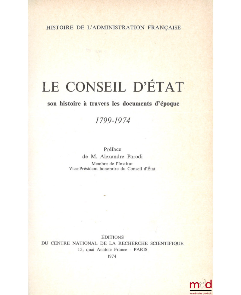 LE CONSEIL D’ÉTAT, SON HISTOIRE À TRAVERS LES DOCUMENTS D’ÉPOQUE 1799-1974, Préface A. Parodi, coll. Hist. de l’Adm. française