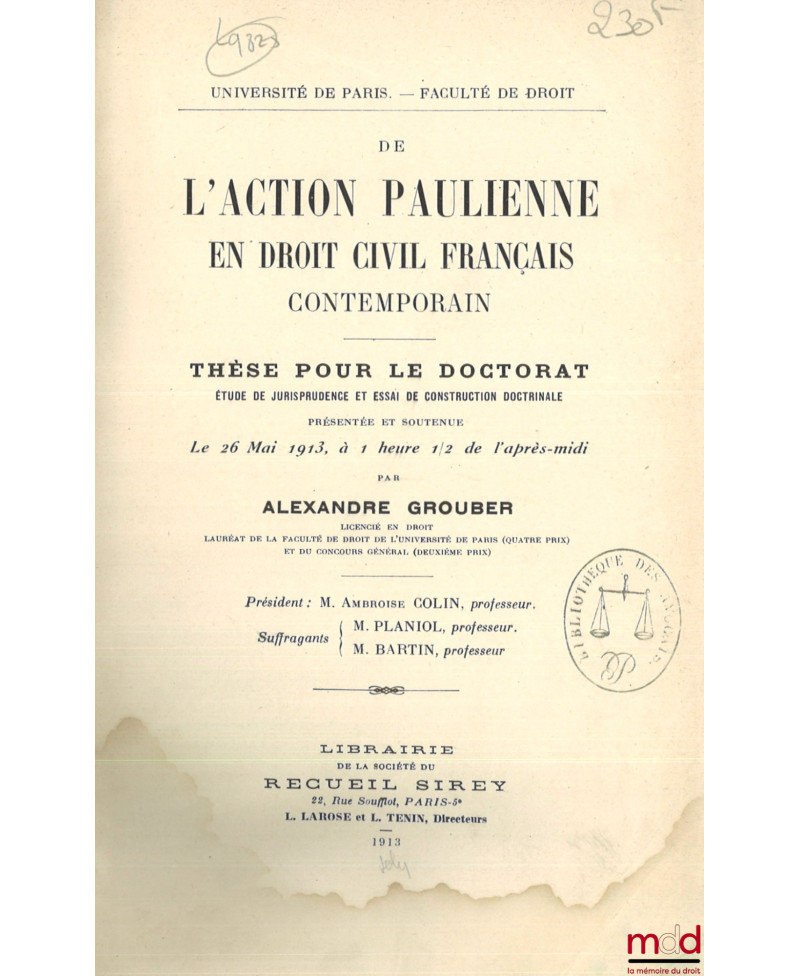 DE L’ACTION PAULIENNE EN DROIT CIVIL FRANÇAIS CONTEMPORAIN, Thèse (Président : Ambroise Colin ; Suffragants : Planiol, Bartin), Université de Paris - Faculté de Droit