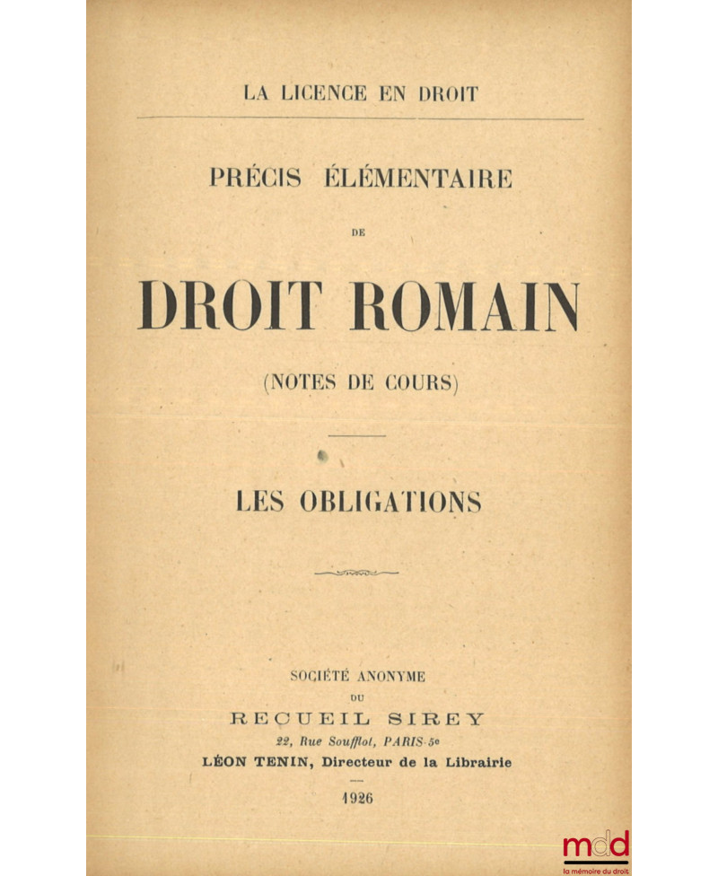 PRÉCIS ÉLÉMENTAIRE DE DROIT ROMAIN (NOTES DE COURS) : LES OBLIGATIONS, coll. La licence en droit