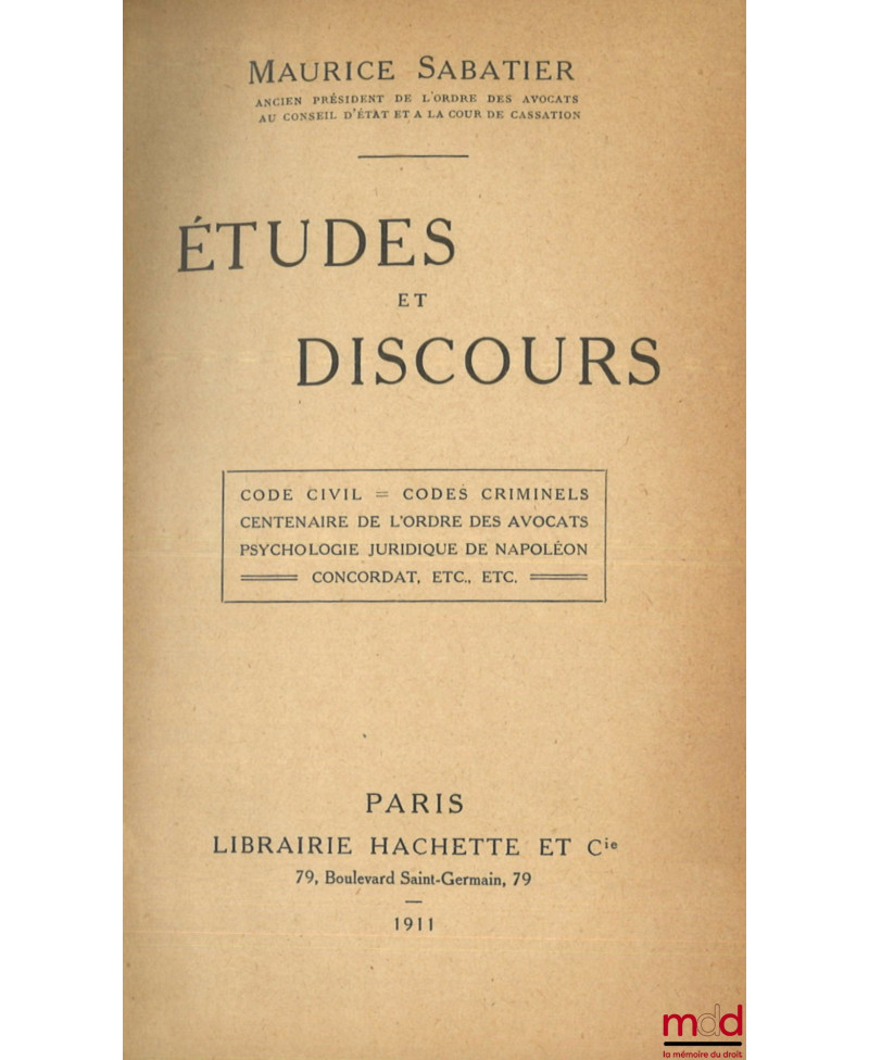 ÉTUDES ET DISCOURS : Code Civil, Codes Criminels, Centenaire de l’Ordre des Avocats, Psychologie Juridique de Napoléon, Concordat, etc., etc.