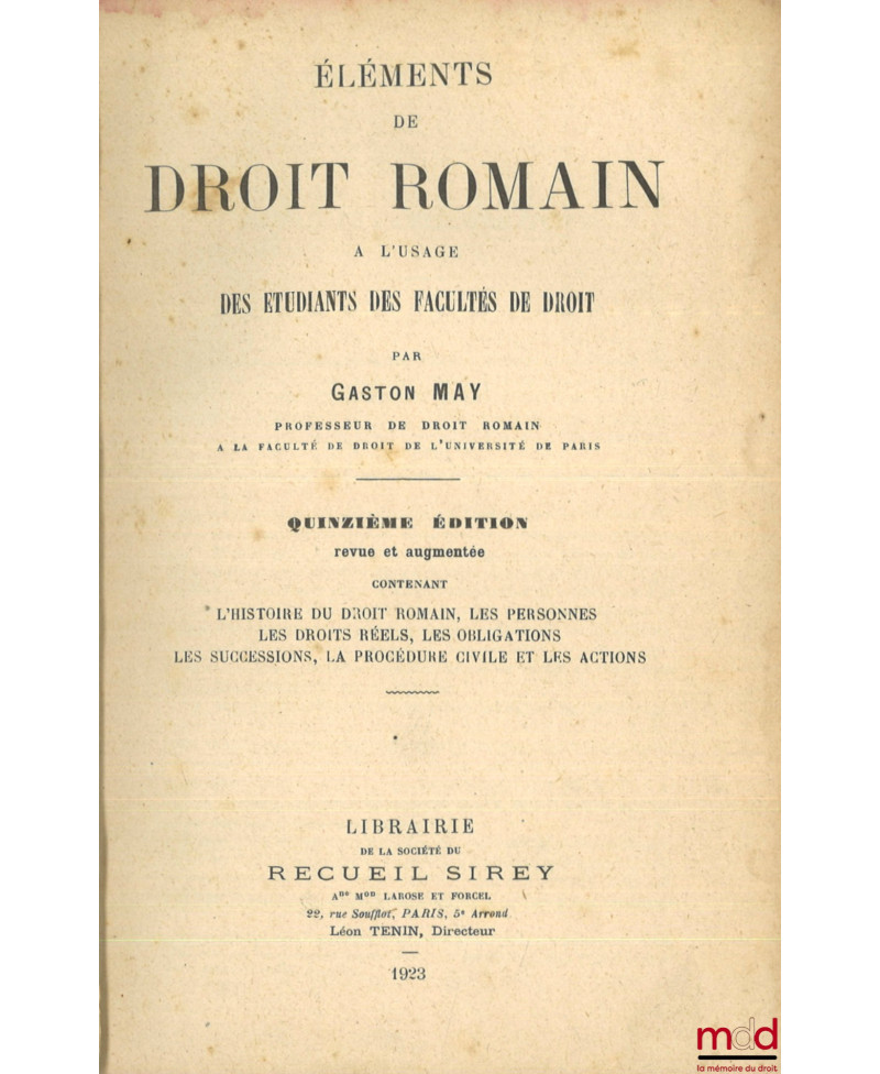 ÉLÉMENTS DE DROIT ROMAIN À L’USAGE DES ÉTUDIANTS DES FACULTÉS DE DROIT, 15e éd. revue et augmentée contenant l’histoire du droit romain, les personnes, les droits réels, les obligations, les successions, la procédure civile et es actions