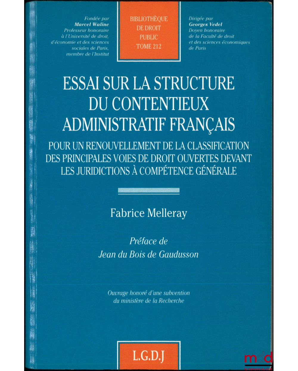 ESSAI SUR LA STRUCTURE DU CONTENTIEUX ADMINISTRATIF FRANÇAIS. Pour un renouvellement de la classification des principales voies de droit ouvertes devant les juridictions à compétence générale, Préface de Jean du Bois de Gaudusson, Bibl. de droit public, t. 212