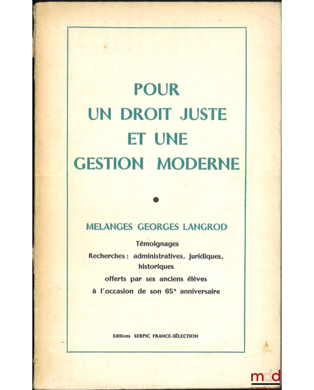 POUR UN DROIT JUSTE ET UNE GESTION MODERNE, Témoignages, Recherches : administratives, juridiques, historiques offerts par ses anciens élèves à l’occasion de son 65e anniversaire
