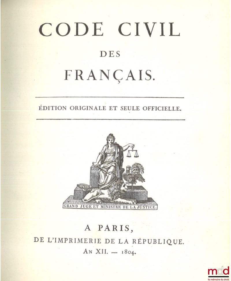 CODE CIVIL DES FRANÇAIS, ÉDITION ORIGINALE ET SEULE OFFICIELLE, Reproduction en fac-similé d’après un exemplaire appartenant à l’Imprimerie Nationale