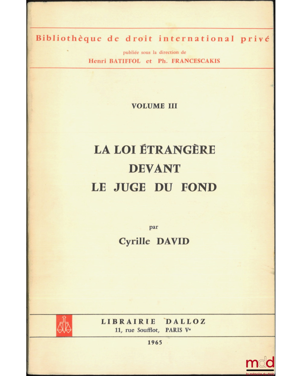 LA LOI ÉTRANGÈRE DEVANT LE JUGE DU FOND, Préface de Henri Batiffol, Bibl. de droit intern. privé, vol. III