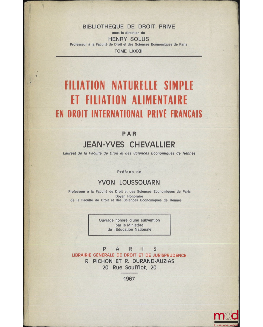 FILIATION NATURELLE SIMPLE ET FILIATION ALIMENTAIRE EN DROIT INTERNATIONAL PRIVÉ FRANÇAIS, Préface de Yvon Loussouarn, Bibl. de droit privé, t. LXXXII