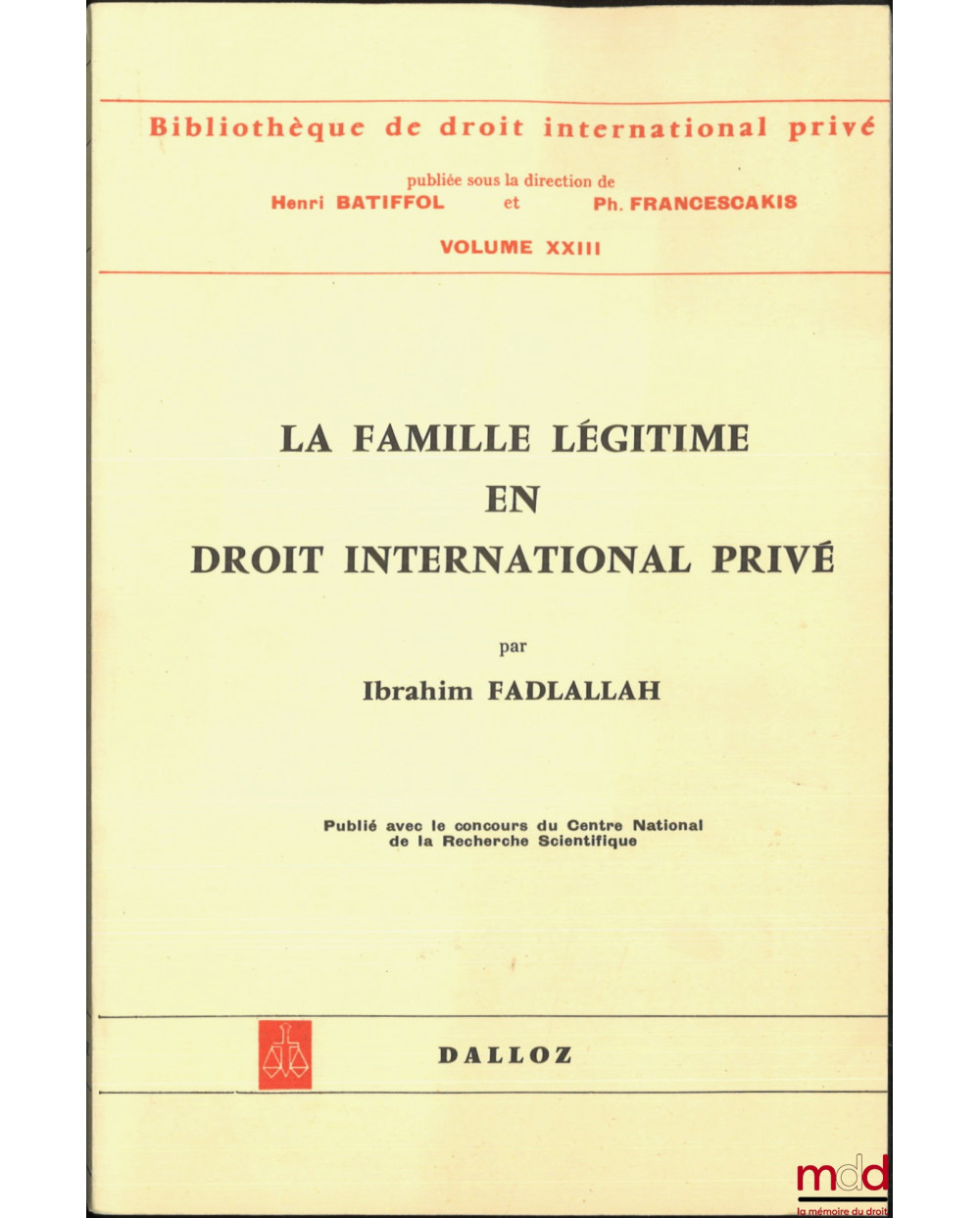 LA FAMILLE LÉGITIME EN DROIT INTERNATIONAL PRIVÉ (Le domaine de la loi applicable aux effets du mariage), Préface de Henri Batiffol, Bibl. de droit intern. privé, vol. XXIII
