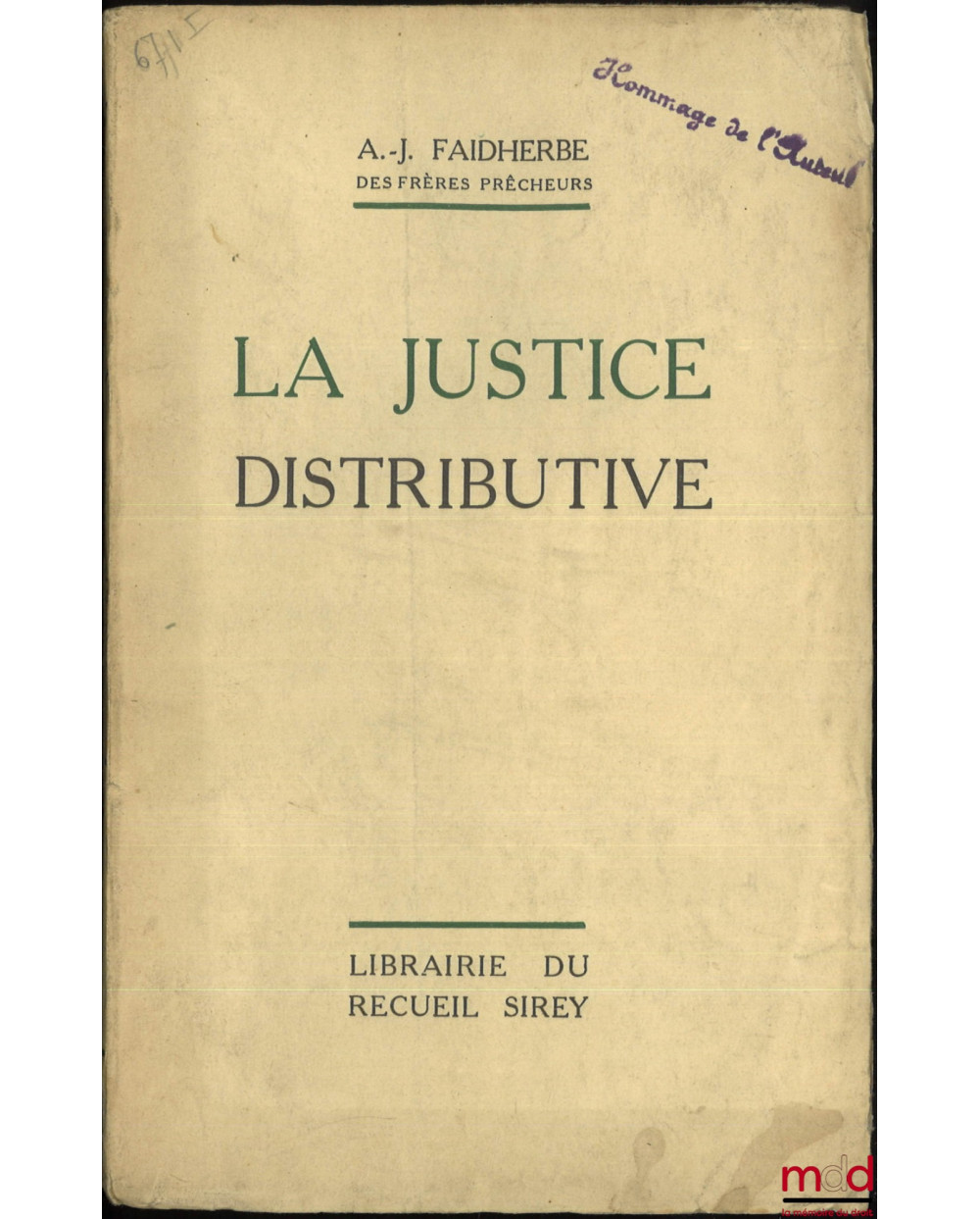 « L’ouvrage du R. P. Faidherbe sur La Justice Distributive est d’abord une excellente mise au point historique. On sait que Saint-Thomas, tout en faisant de grands éloges de cette vertu, n’en traite nulle part ex-professo, sauf dans les Éthiques où il lui consacre seulement quelques leçons. Aussi n’est-il pas étonnant que la plupart des commentateurs, surtout modernes (sauf sans doute le R. P. Delos) n’aient pas accordé à la Distributive l’importance qu’elle mérite ou même aient complètement déformé la doctrine du Maître. Il fallait donc un spécialiste de la philosophie thomiste pour être capable de reconstruire en quelque sorte toute la théorie de la Justice distributive à partir des principes fondamentaux de la doctrine et des quelques indications particulières sur ce sujet. Nul n’était mieux qualifié que le P. Faidherbe pour mener à bien un tel travail. »