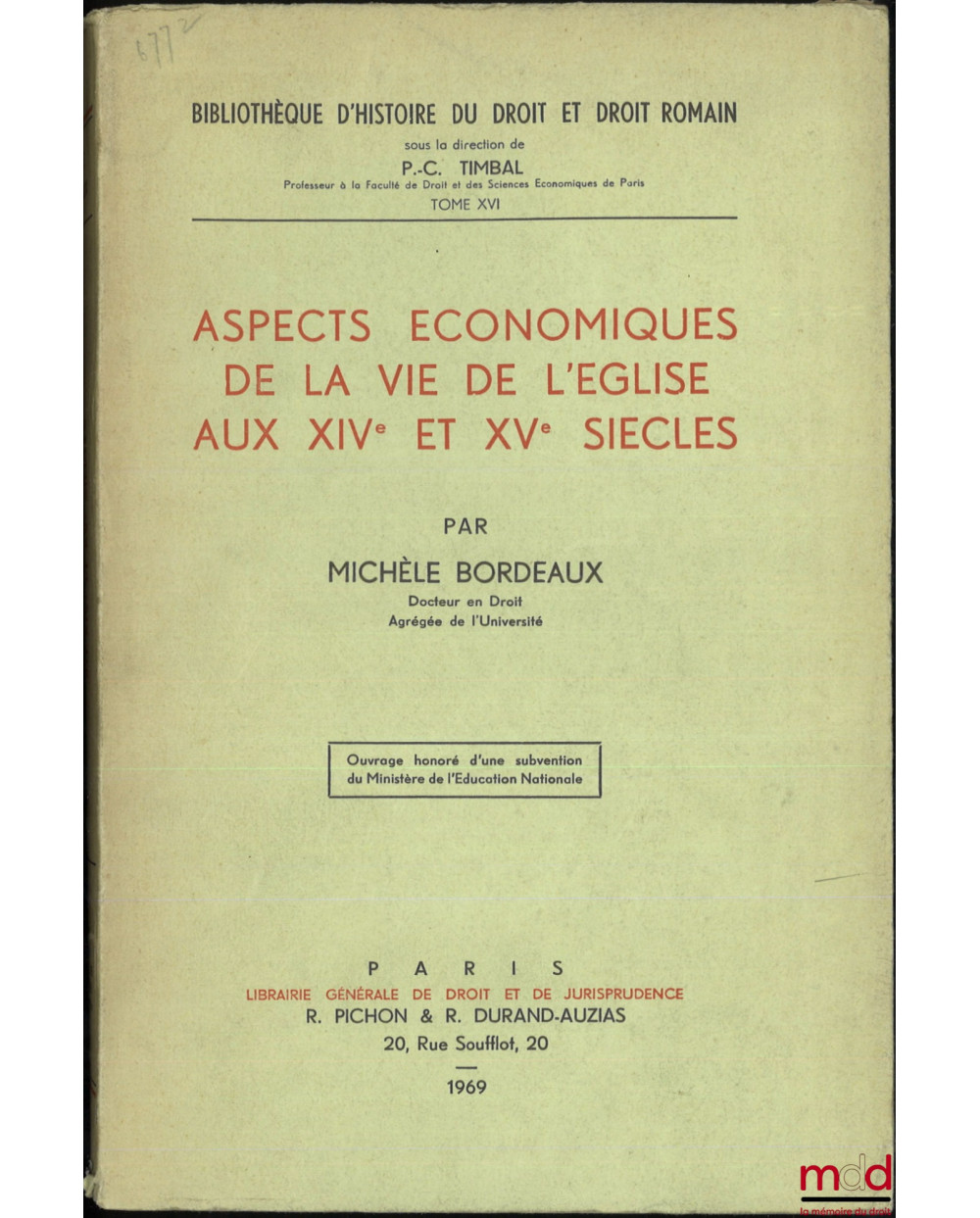ASPECTS ÉCONOMIQUES DE LA VIE DE L’ÉGLISE AU XIVe ET XVe SIÈCLES, Bibl. d’Histoire du Droit et Droit romain, t. XVI
