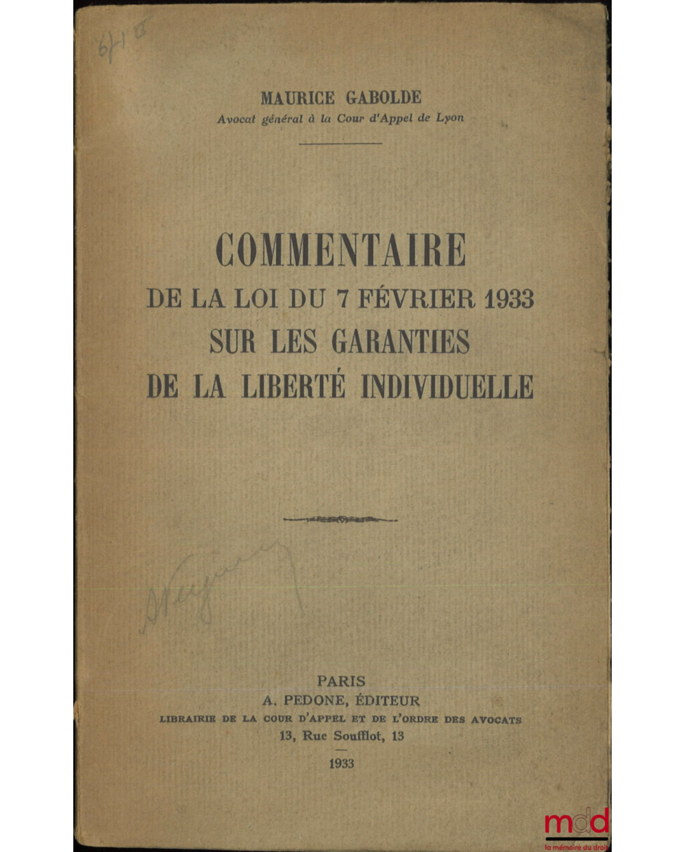 COMMENTAIRE DE LA LOI DU 7 FÉVRIER 1933 SUR LES GARANTIES DE LA LIBERTÉ INDIVIDUELLE