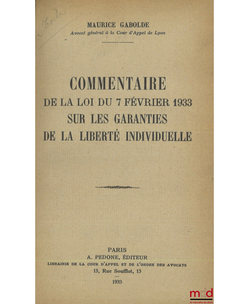 COMMENTAIRE DE LA LOI DU 7 FÉVRIER 1933 SUR LES GARANTIES DE LA LIBERTÉ INDIVIDUELLE