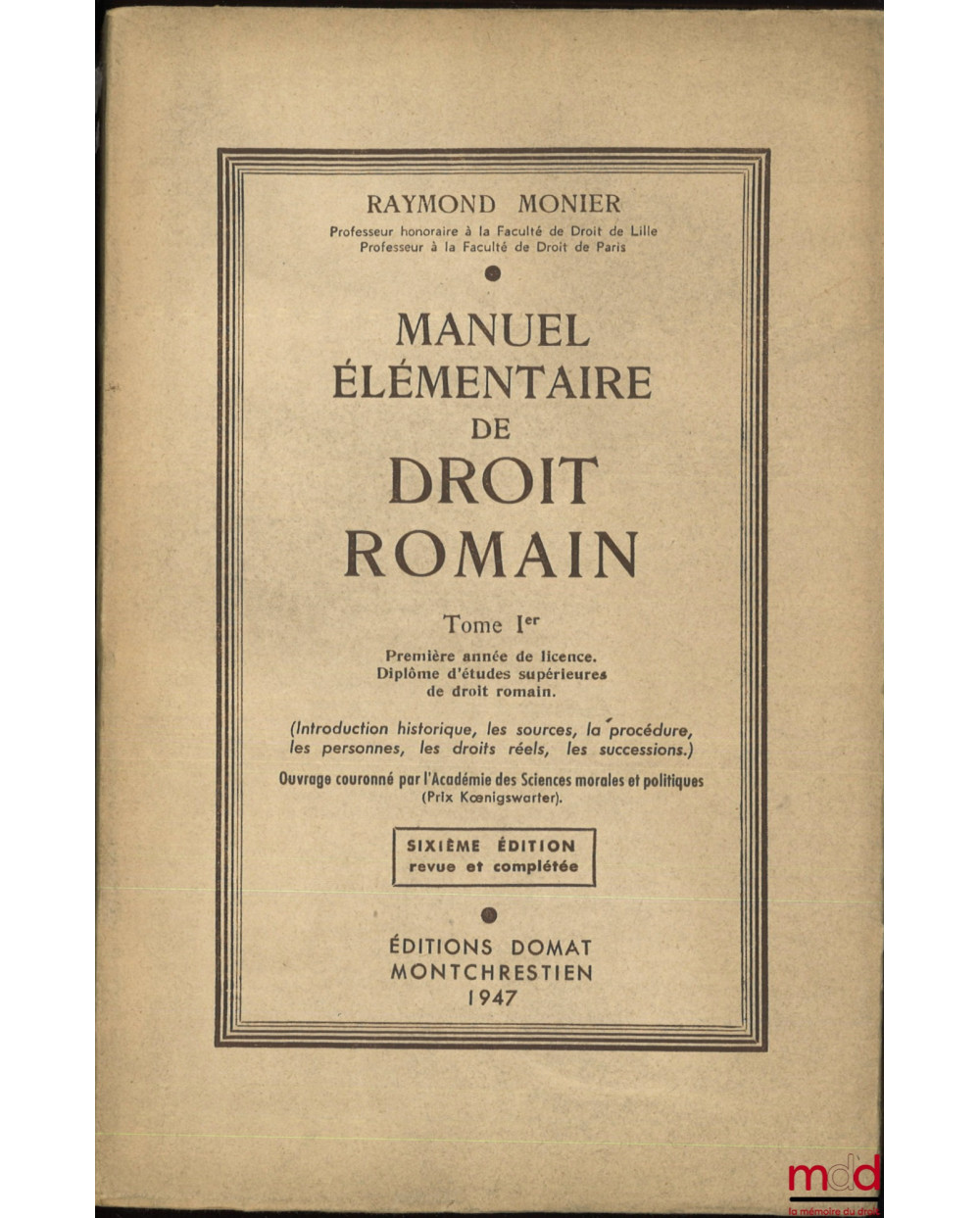 MANUEL ÉLÉMENTAIRE DE DROIT ROMAIN, t. I [seul] : Première année de licence (Introduction historique, les sources, la procédure, les personnes, les droits réels, les successions.), 6e éd. revue et complétée
