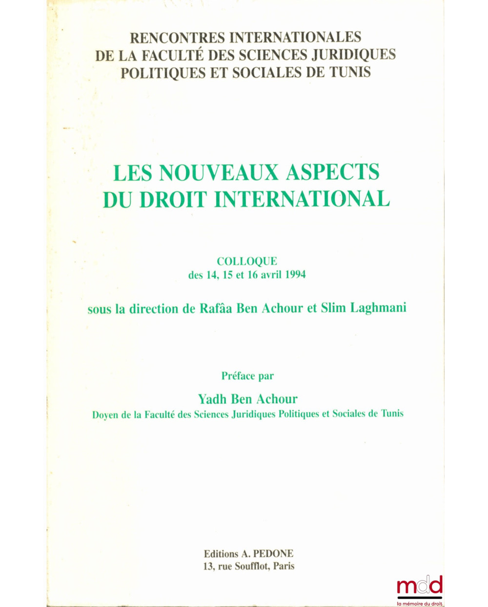LES NOUVEAUX ASPECTS DU DROIT INTERNATIONAL, Rencontres internationales de la Faculté des sc. juridiques politiques et sociales de Tunis, les 14, 15 et 16 avril 1994 sous la direction de Rafâa Ben Achour et Slim Laghmani