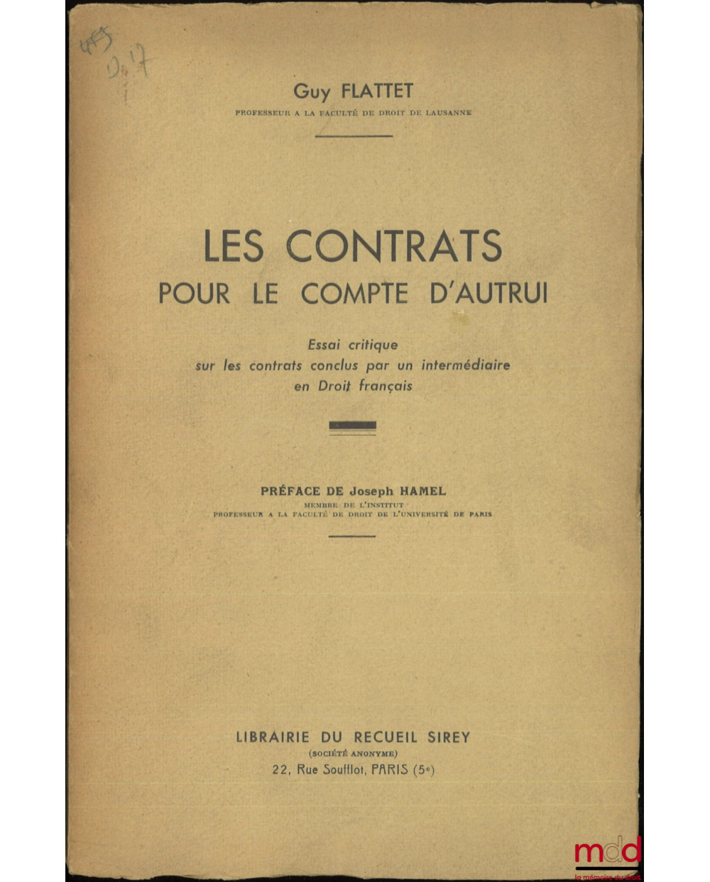 LES CONTRATS POUR LE COMPTE D’AUTRUI, Essai critique sur les contrats conclus par un intermédiaire en droit français, Préface de Joseph Hamel