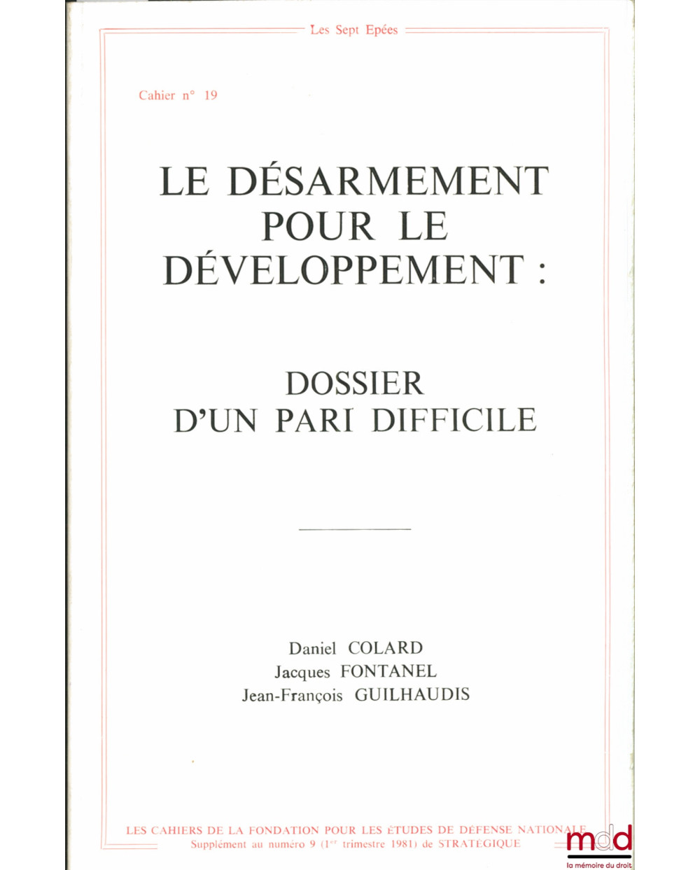 LE DÉSARMEMENT POUR LE DÉVELOPPEMENT : DOSSIER D’UN PARI DIFFICILE, Les cahiers de la Fondation pour les études de défense nationale, Stratégique, n° 19