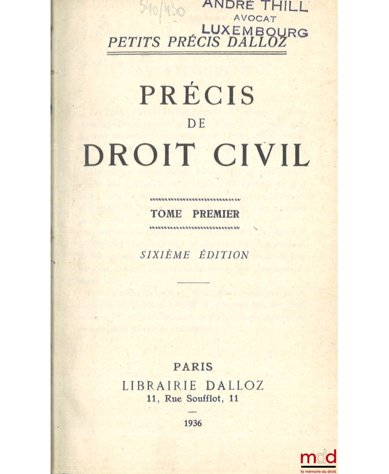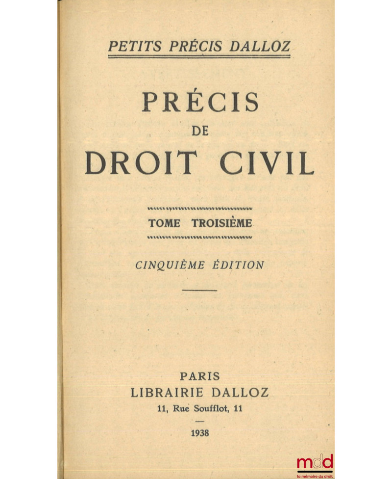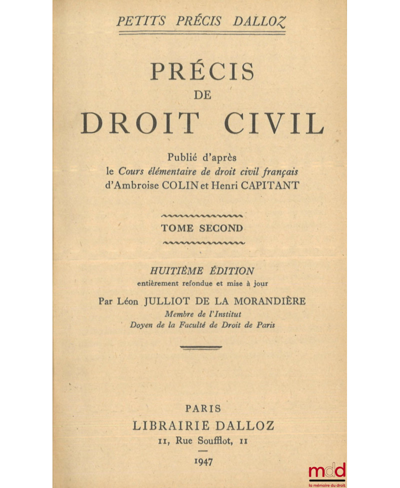 PRÉCIS DE DROIT CIVIL, Publié d’après le Cours élémentaire de Droit civil français d’Ambroise Colin et Henri Capitant, t. I : 6e éd. avec Addendum mettant à jour au 1er nov. 1936, t. II : 8e éd. entièrement refondue et mise à jour par Léon Julliot de La Morandière avec Addendum mettant à jour au 15 juillet 1948, t. III : 5e éd, coll. Petits Précis Dalloz