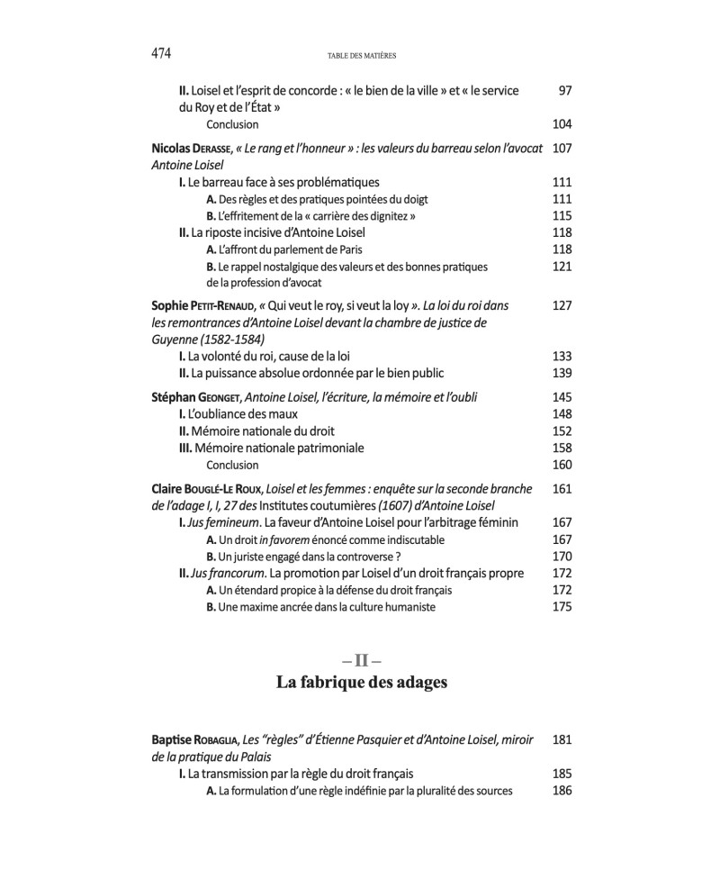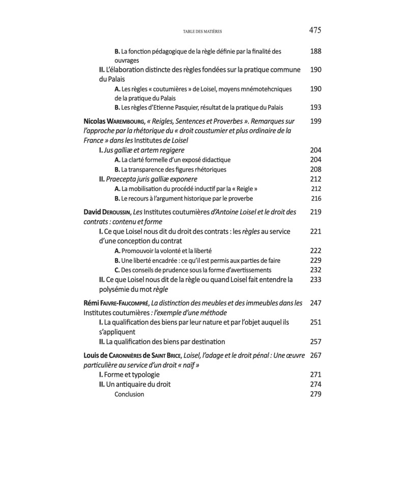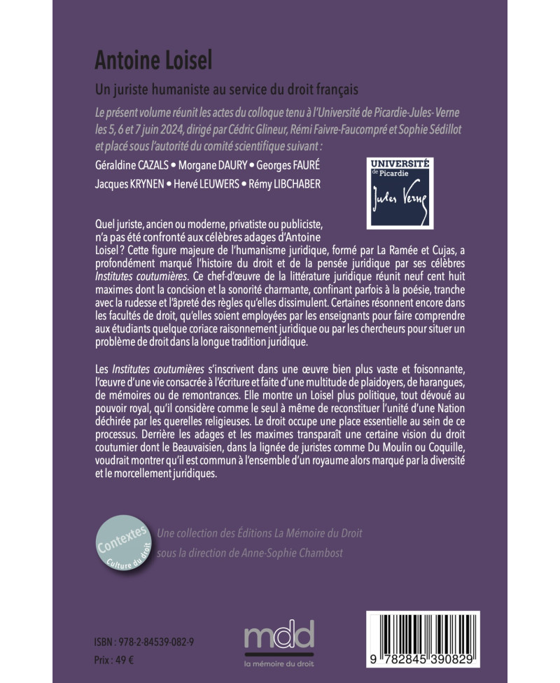 ANTOINE LOISEL. Un juriste humaniste au service du droit français. Sous la direction de Cédric GLINEUR, Rémi FAIVRE-FAUCOMPRÉ et Sophie SÉDILLOT, Avant-propos de Cédric Glineur, Le présent volume réunit les actes du colloque tenu à l’Université de Picardie-Jules-Verne les 5, 6 et 7 juin 2024 placé sous l’autorité du comité scientifique suivant : Géraldine CAZALS • Morgane DAURY • Georges FAURÉ • Jacques KRYNEN • Hervé LEUWERS • Rémy LIBCHABER, coll. Contextes. Culture du droit, t. IV