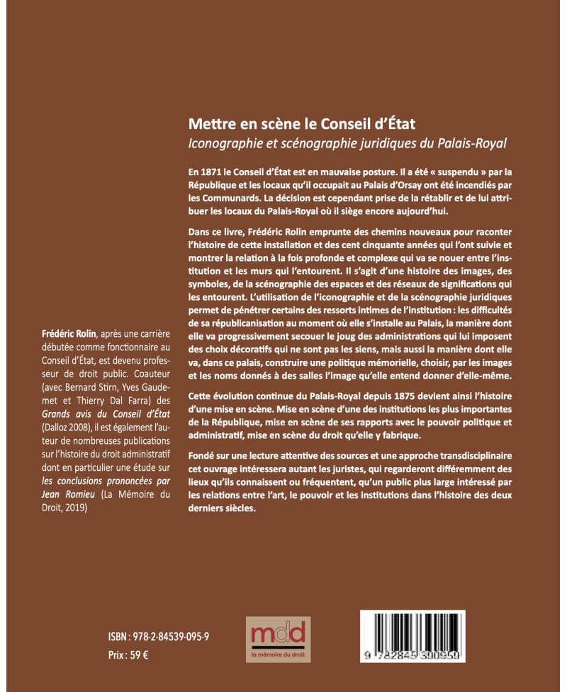 En 1871 le Conseil d’État est en mauvaise posture. Il a été « suspendu » par la République et les locaux qu’il occupait au Palais d’Orsay ont été incendiés par les Communards. La décision est cependant prise de la rétablir et de lui attribuer les locaux du Palais­Royal où il siège encore aujourd’hui. Dans ce livre, Frédéric Rolin emprunte des chemins nouveaux pour raconter l’histoire de cette installation et des cent cinquante années qui l’ont suivie et montrer la relation à la fois profonde et complexe qui va se nouer entre l’institution et les murs qui l’entourent. Il s’agit d’une histoire des images, des symboles, de la scénographie des espaces et des réseaux de significations qui les entourent. L’utilisation de l’iconographie et de la scénographie juridiques permet de pénétrer certains des ressorts intimes de l’institution : les difficultés de sa républicanisation au moment où elle s’installe au Palais, la manière dont elle va progressivement secouer le joug des administrations qui lui imposent des choix décoratifs qui ne sont pas les siens, mais aussi la manière dont elle va, dans ce palais, construire une politique mémorielle, choisir, par les images et les noms donnés à des salles l’image qu’elle entend donner d’elle­-même. Cette évolution continue du Palais­Royal depuis 1875 devient ainsi l’histoire d’une mise en scène. Mise en scène d’une des institutions les plus importantes de la République, mise en scène de ses rapports avec le pouvoir politique et administratif, mise en scène du droit qu’elle y fabrique. Fondé sur une lecture attentive des sources et une approche transdisciplinaire cet ouvrage intéressera autant les juristes, qui regarderont différemment des lieux qu’ils connaissent ou fréquentent, qu’un public plus large intéressé par les relations entre l’art, le pouvoir et les institutions dans l’histoire des deux derniers siècles.