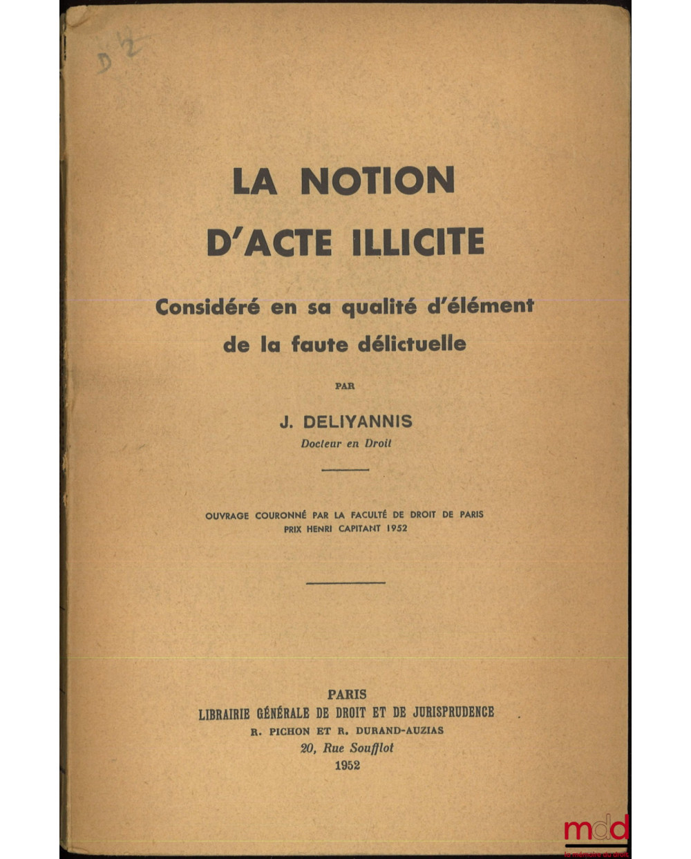 « La notion d’illicéité avait donné lieu, en droit français, à maintes réflexions et controverses, mais elle soulevait encore, dans le droit français de la responsabilité, des questions fondamentales, notamment sur le point de savoir si l’illicéité de l’acte devait être considérée comme une condition nécessaire et essentielle de l’existence d’une faute génératrice de responsabilité. La thèse, tout à fait remarquable, reçut la mention très bien et la Faculté de droit de Paris décerna à l’auteur le prix “Henri Capitant”. Cette thèse est encore aujourd’hui un ouvrage très cité. » (J. Patarin, RIDC n° 2/2000, P. 445).