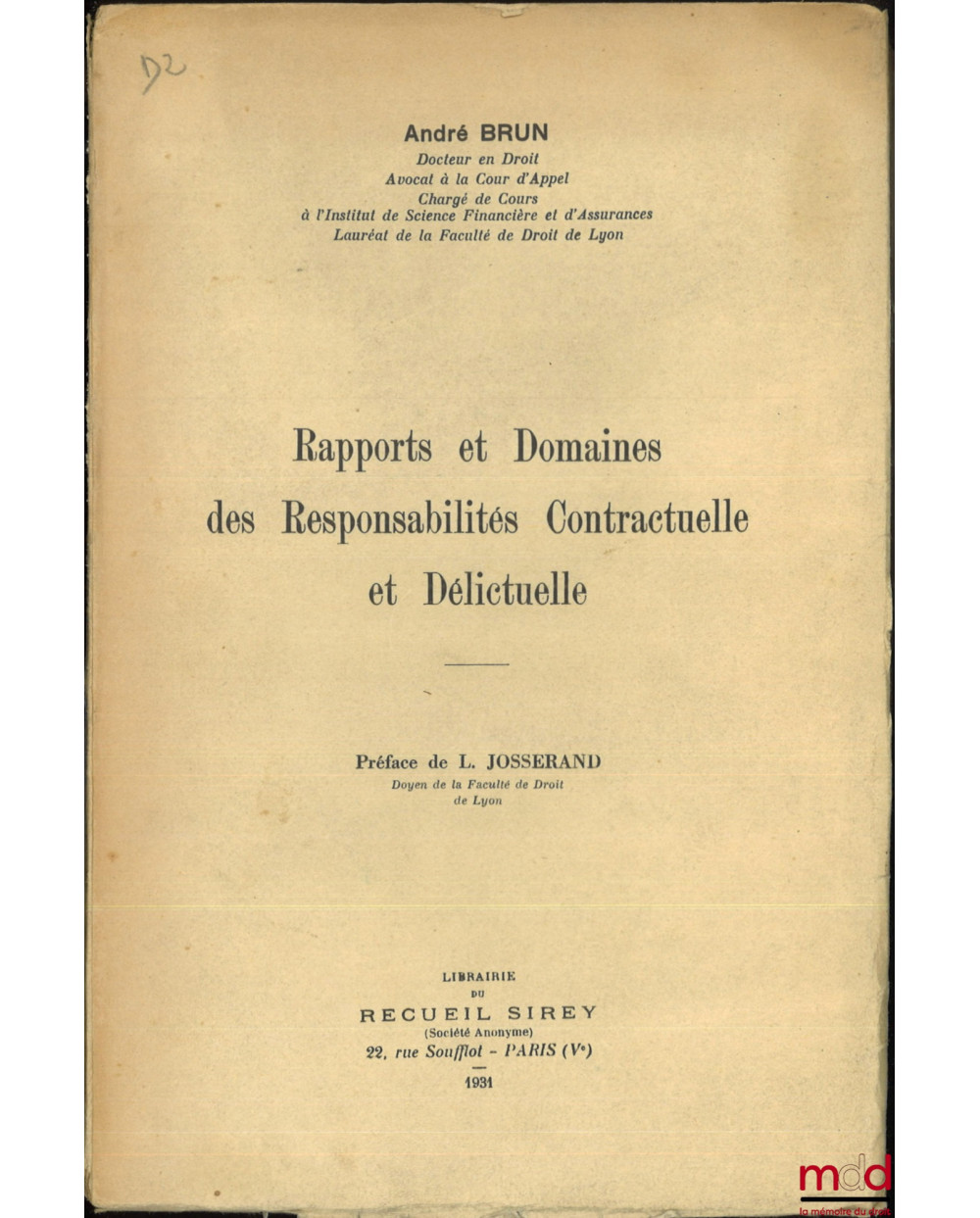 RAPPORTS ET DOMAINES DES RESPONSABILITÉS CONTRACTUELLE ET DÉLICTUELLE, Préface de L. Josserand