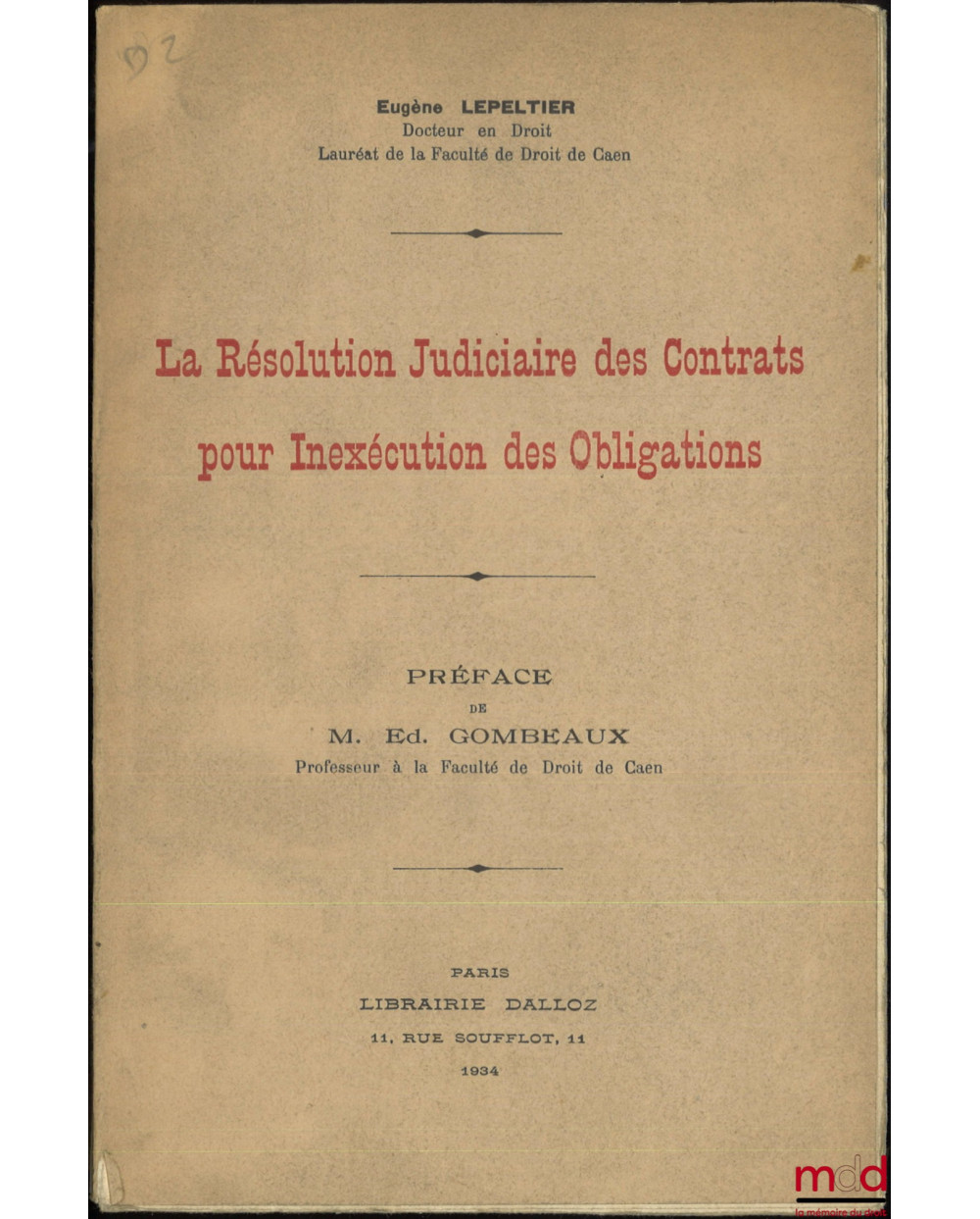 LA RÉSOLUTION JUDICIAIRE DES CONTRATS POUR INEXÉCUTION DES CONTRATS, Préface de Edmond Gombeaux