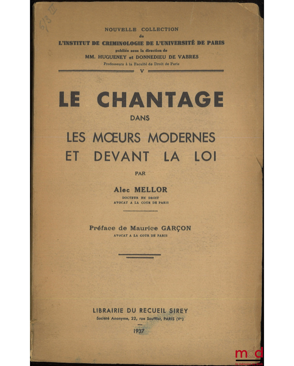 LE CHANTAGE DANS LES MOEURS MODERNES ET DEVANT LA LOI, Préface de Maurice Garçon, Nouvelle coll. de l’Institut de criminologie de l’Université de Paris, t. V