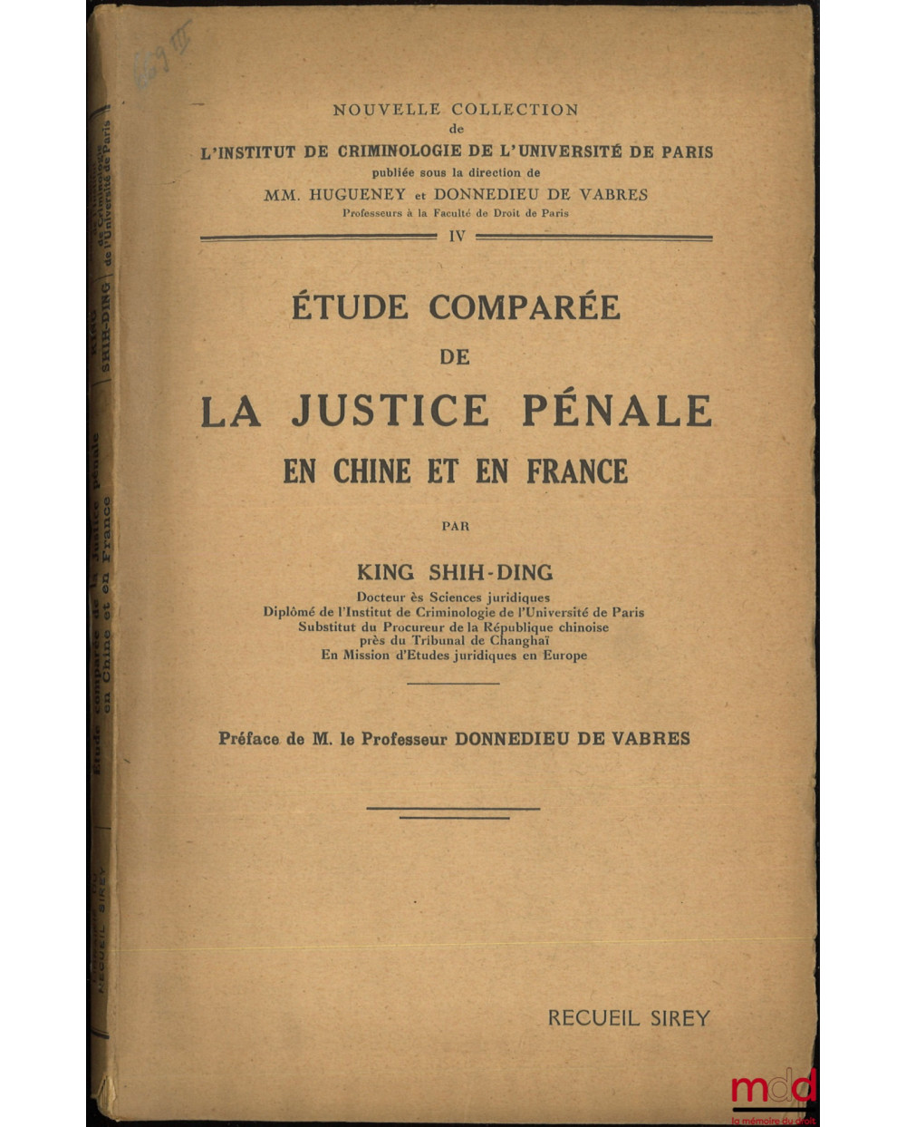 ÉTUDE COMPARÉE DE LA JUSTICE PÉNALE EN CHINE ET EN FRANCE, Préface de Donnedieu de Vabres, Nouvelle collection de l’Inst. de criminologie de l’Université de Paris, tome IV