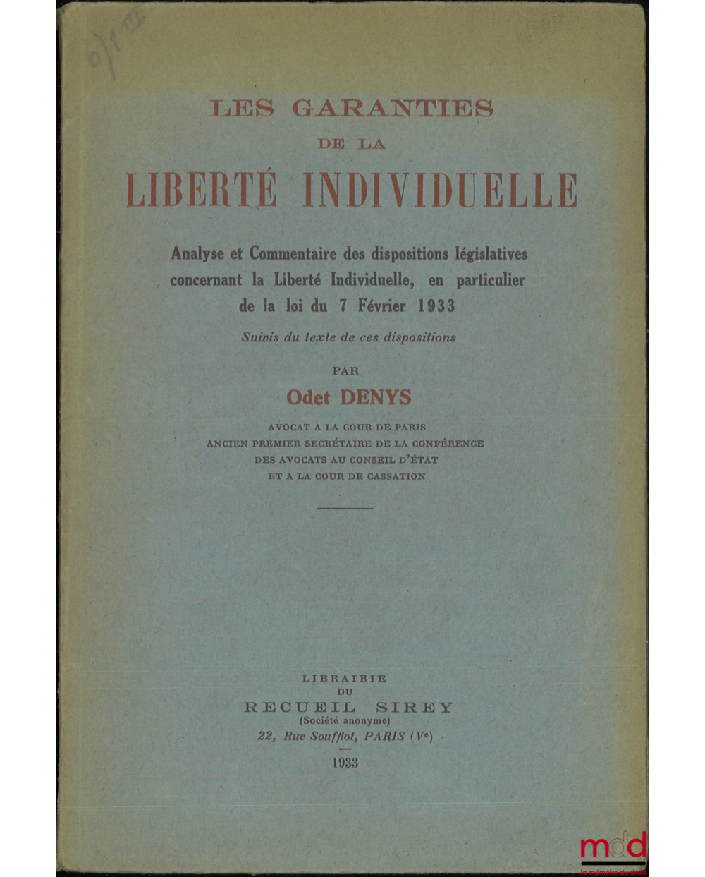 LES GARANTIES DE LA LIBERTÉ INDIVIDUELLE, Analyse et Commentaire des dispositions législatives concernant la Liberté Individuelle en particulier de la loi du 7 février 1933, Suivis du texte de ces dispositions