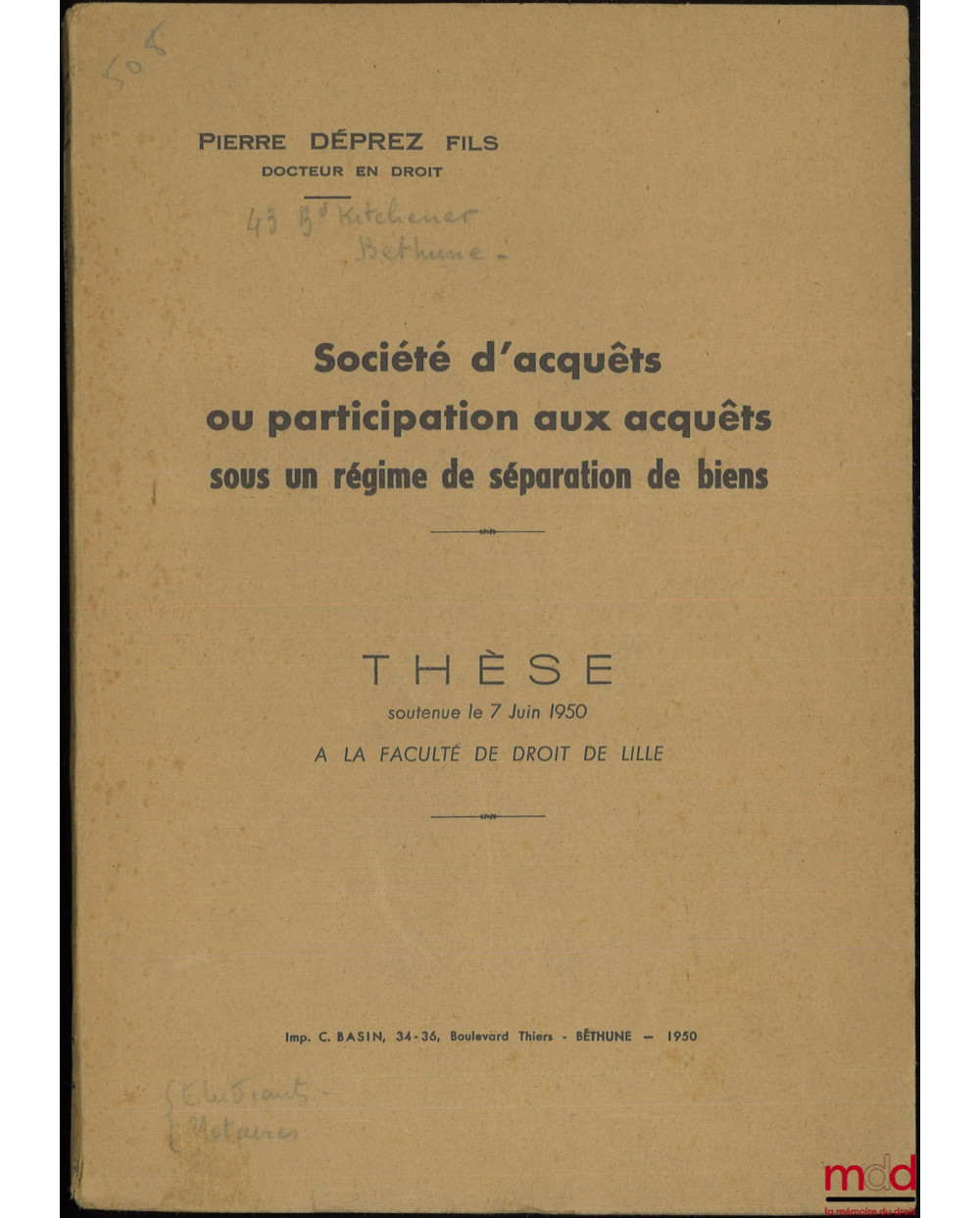 SOCIÉTÉ D’ACQUÊTS OU PARTICIPATION AUX ACQUÊTS SOUS UN RÉGIME DE SÉPARATION DE BIENS, Thèse soutenue le 7 juin 1950 à la Faculté de droit de Lille