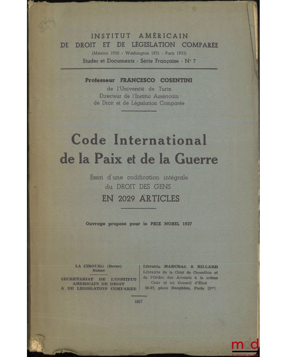 CODE INTERNATIONAL DE LA PAIX ET DE LA GUERRE, Essai d’une codification intégrale du Droit des gens en 2029 articles, Institut américain de droit et de législation comparée, Études et documents - Série Française - n° 7