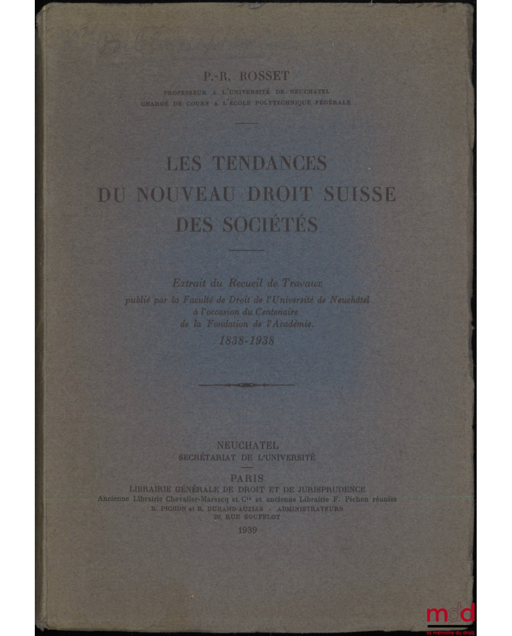 LES TENDANCES DU NOUVEAU DROIT SUISSE DES SOCIÉTÉS, Extrait du Recueil de Travaux publié par la Faculté de Droit de l’Université de Neuchâtel à l’occasion du Centenaire de la Fondation de l’Académie, 1838-1938