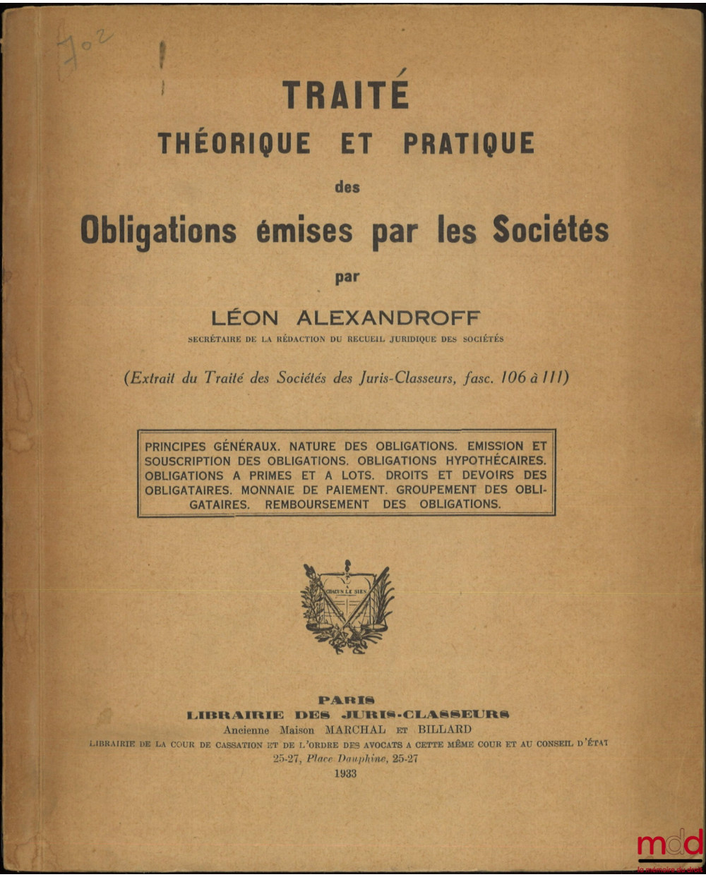 TRAITÉ THÉORIQUE ET PRATIQUE DES OBLIGATIONS ÉMISES PAR LES SOCIÉTÉS, (Extrait du Traité des Sociétés des Juris-Classeurs, fasc. 106 à 111), Principes généraux, Nature des obligations, Émission et souscription des obligations, Obligations hypothécaires, Obligations à primes et à lots, Droits et devoirs des obligataires, Monnaie de paiement, Groupement des obligataires, Remboursement des obligations.